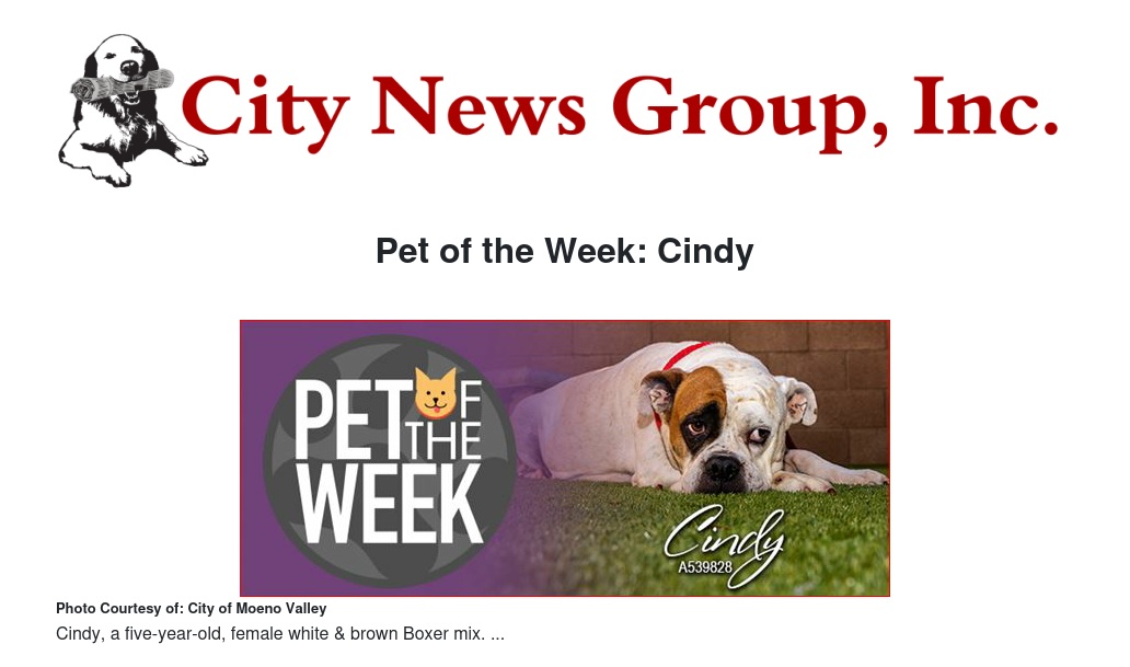 If you would like to make Cindy or any pet from the Moreno Valley Animal Shelter part of your family, please contact the Moreno Valley Animal Shelter at 951.413.3790 or visit www.moval.org/pets. |