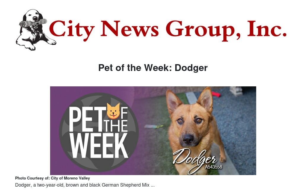 If you would like to make Dodger, or any pet from the Moreno Valley Animal Shelter, part of your family, please call 951.413.3790 or visit moval.org/pets.