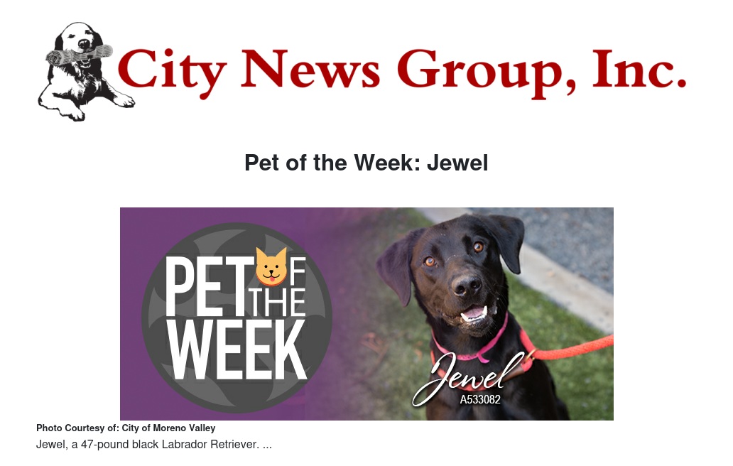 Our Pet of the Week is Jewel, a 47-pound black Labrador Retriever. At 18 months, she still has the sweetness and high energy of a puppy, but is very attentive and anxious to learn new tricks. She's comfortable on a leash and would be a great company on Moreno Valley's beautiful trails and hikes.