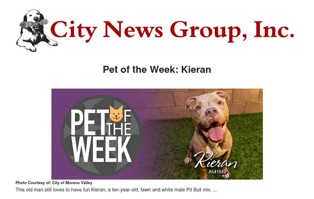 If you would like to make Kieran or any pet from the Moreno Valley Animal Shelter part of your family, please call 951.413.3790 or visit moval.org/pets.