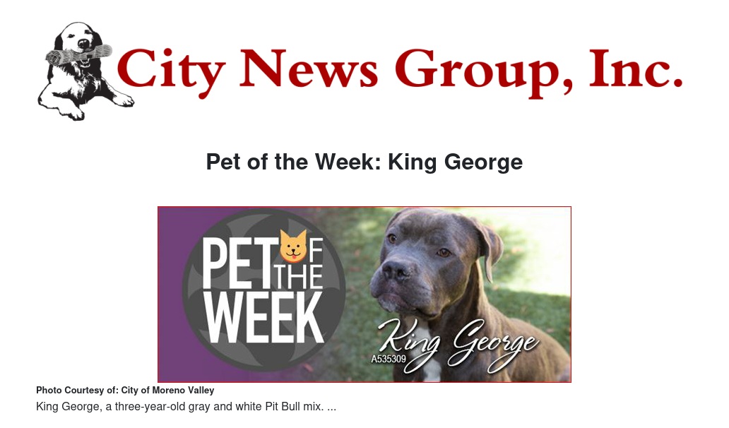 If you would like to make King George or any pet from the Moreno Valley Animal Shelter part of your family, please contact the Moreno Valley Animal Shelter at 951.413.3790 or visit www.moval.org/pets. |