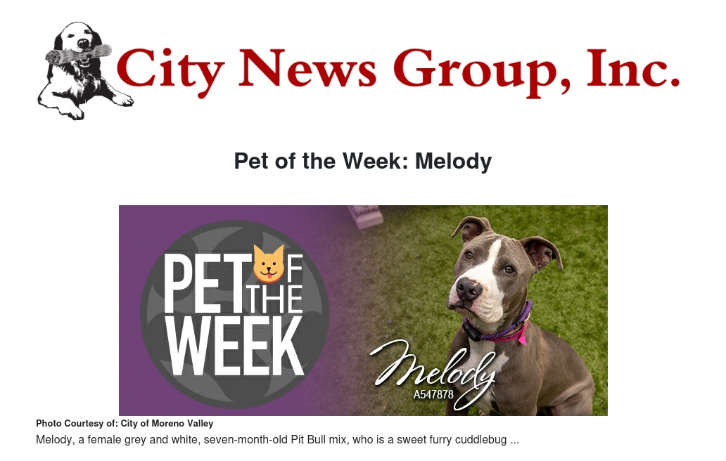 If you would like to make Melody, or any pet from the Moreno Valley Animal Shelter, part of your family, please call 951.413.3790 or visit moval.org/pets.