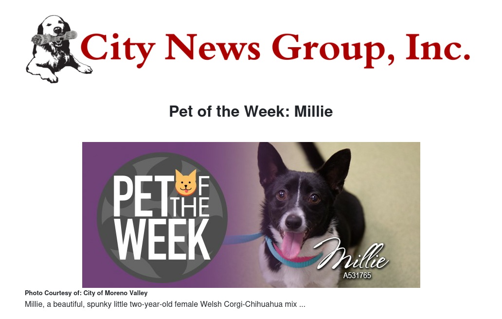 Our Pet of the Week is Millie, a beautiful, spunky little two-year-old female Welsh Corgi-Chihuahua mix. Millie is a bouncing bundle of playful joy with bright eyes and a heartwarming smile. She gets along well with other dogs and is comfortable on a leash.