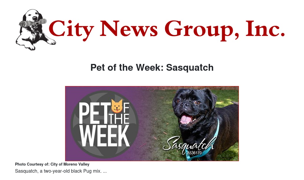 If you would like to make Sasquatch or any pet from the Moreno Valley Animal Shelter part of your family, please contact the Moreno Valley Animal Shelter at 951.413.3790 or visit www.moval.org/pets.
