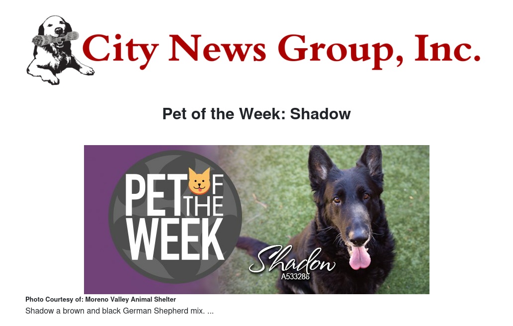 If you would like to make Shadow or any pet from the Moreno Valley Animal Shelter part of your family, please contact the Moreno Valley Animal Shelter at 951.413.3790 or visit www.moval.org/pets.