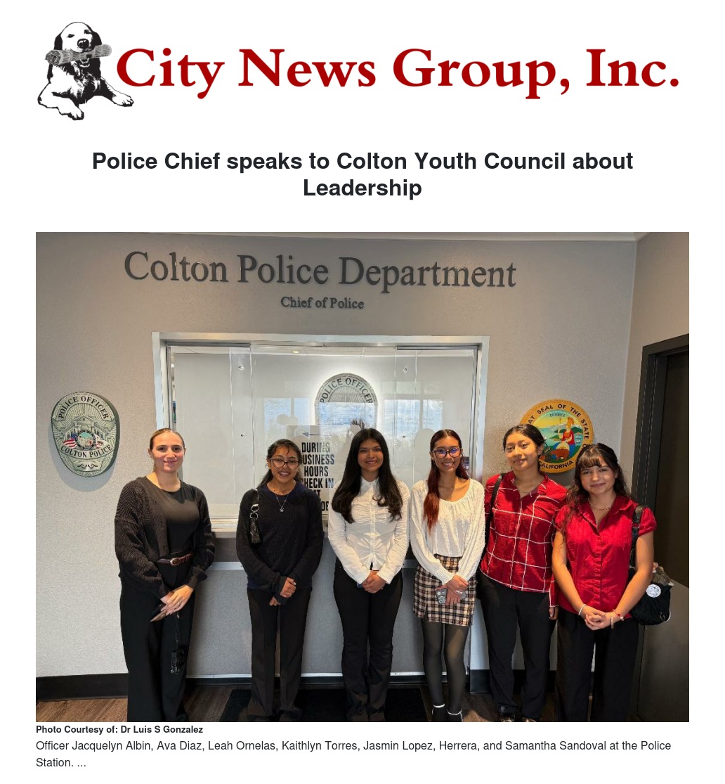 Last week was the November meeting of the City of Colton Youth Council. Starting in August, the Youth Council has continued to meet monthly to learn about leadership, the history of Colton and the basic operations of our city. The focus last week was on the Colton Police Department, which was presented by Colton Police Chief Mr. Anthony Vega. Previous topics thus far included Youth Leadership, Community Services and the Colton Fire Department. “The Youth Council is a terrific program that prepares our young community leaders for future growth and success in their careers.” commented Chief Vega, who added, “This group of young leaders gives me hope for our future.”