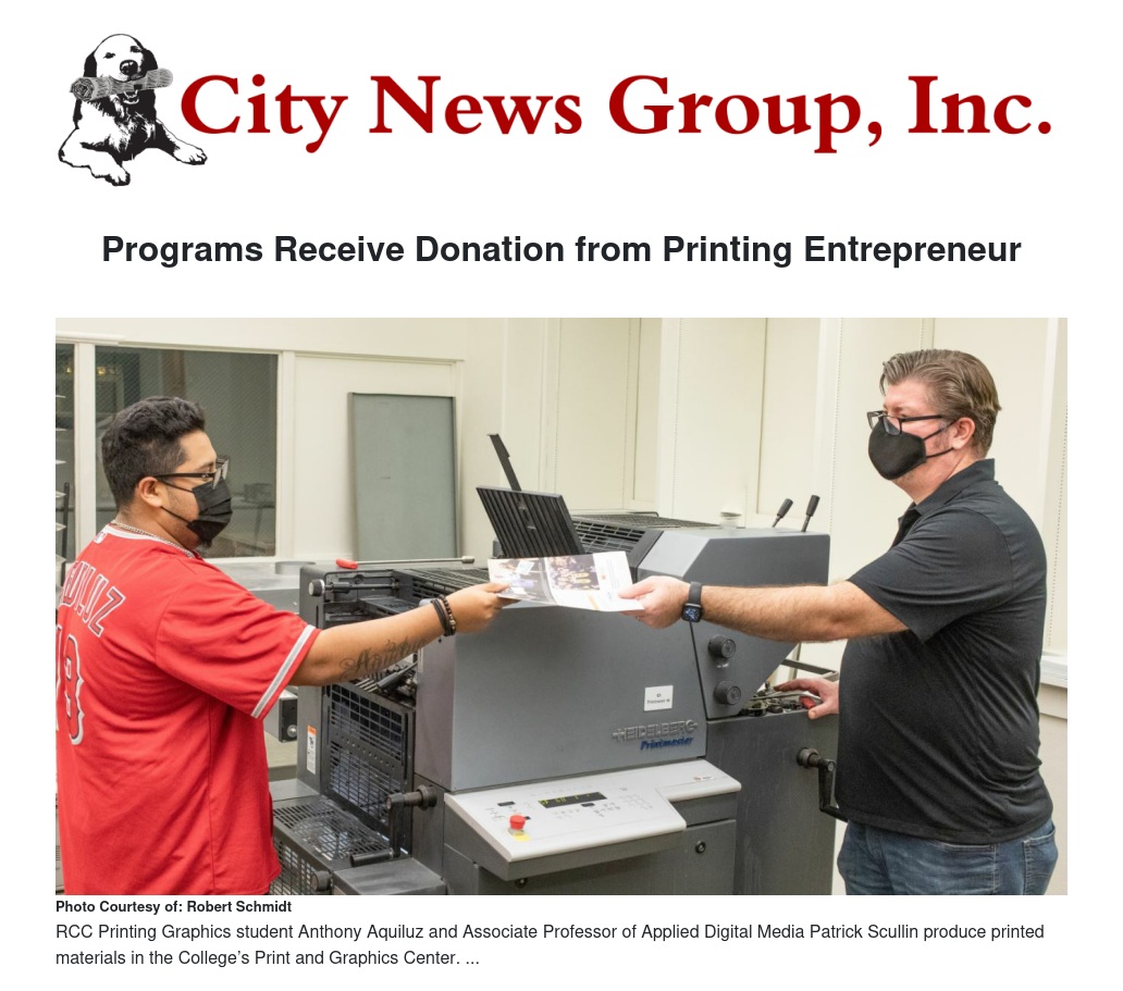 RCC’s ADM and Printing program has a strong history in printing graphic education. The first trade-printing course was offered in 1921. Thanks to this donation to the ADM and Printing program will become more viable and better positioned to train students for careers in commercial printing.