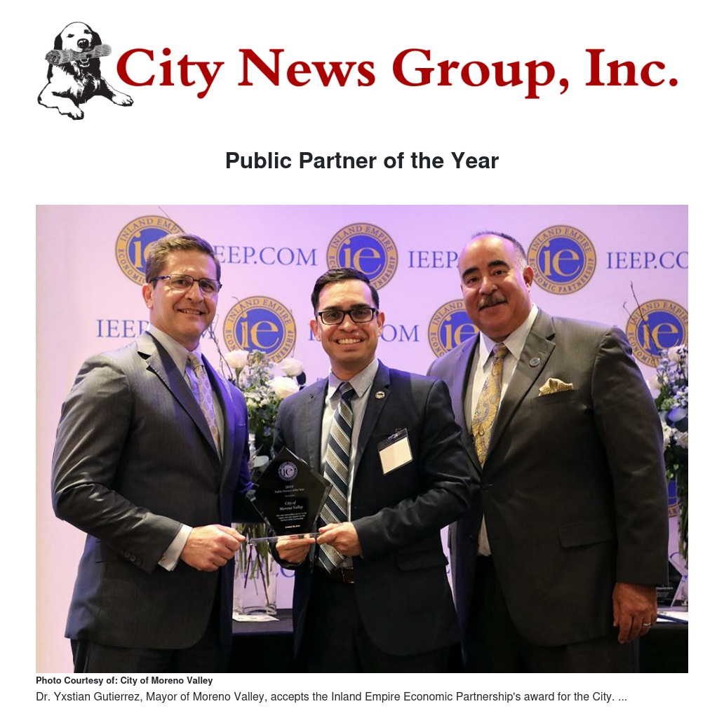 “The Board of Directors of the Inland Empire Economic Partnership are pleased to honor the City of Moreno Valley as the Public Partner of the Year," said IEEP President and CEO Paul Granillo. "The City of Moreno Valley continues to be a leader in business attraction and workforce development. This award acknowledges the leadership of the City Council and staff for their hard work and continued partnership with the greater Inland Empire.”