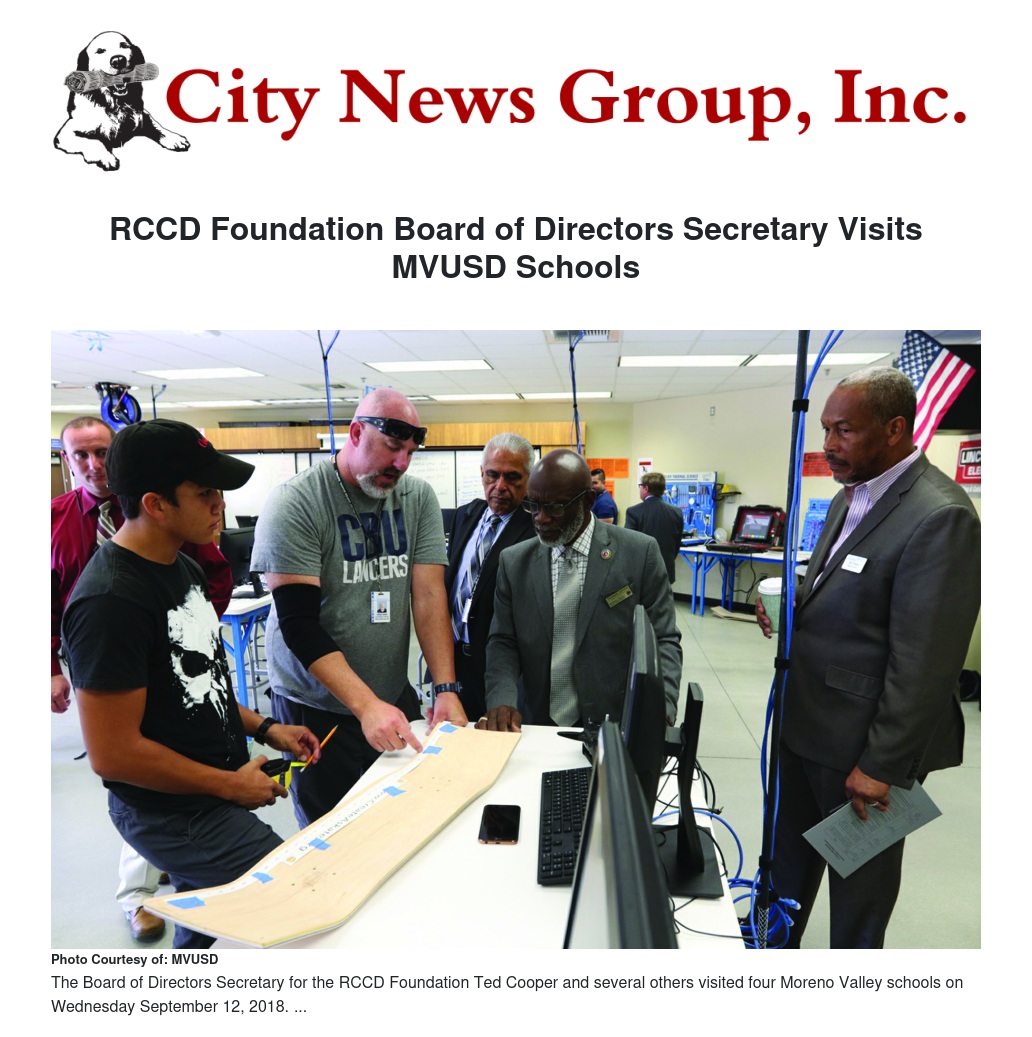 The Board of Directors Secretary for the RCCD Foundation Ted Cooper visited several MVUSD schools with Superintendent Dr. Martinrex Kedziora, Board of Education Vice President Jesús Holguín and Clerk Cleveland Johnson on Wednesday. The tour stopped at Vista del Lago High School's new manufacturing and logistics lab, Vista Heights Middle School and Canyon Springs High School's International Baccalaureate programs and Edgemont Elementary School to see their new building and Maker Spaces.