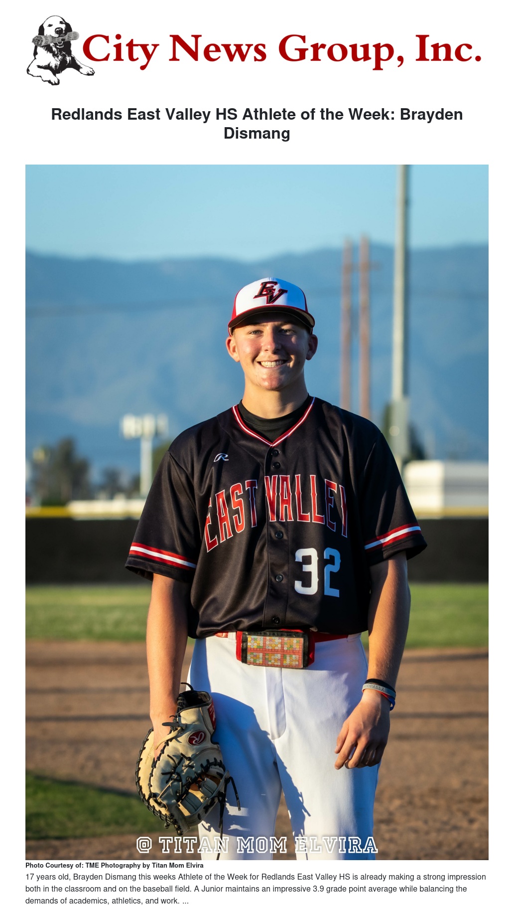 Redlands East Valley HS Athlete of the Week: Brayden Dismang by Titan Mom Elvira - City News Group, Inc.