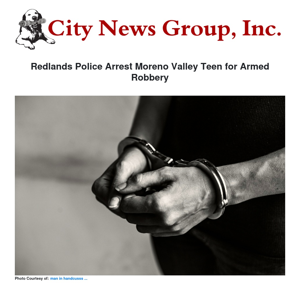Redlands Police developed leads from surveillance video and witness statements and identified a juvenile suspect. On Thursday, April 18, detectives served a search warrant in the 12000 block of Alona Street in Moreno Valley. The teen suspect was arrested in possession of the stolen gold chain. Police also recovered ammunition during the search of the residence.