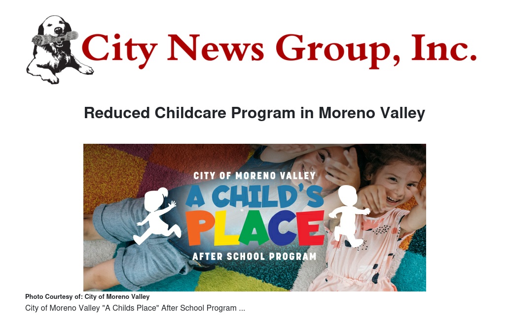The City of Moreno Valley’s Parks and Community Services Department is now accepting childcare applications for A Child’s Place, an after-school program designed for children ages four years and nine months to 12 years.