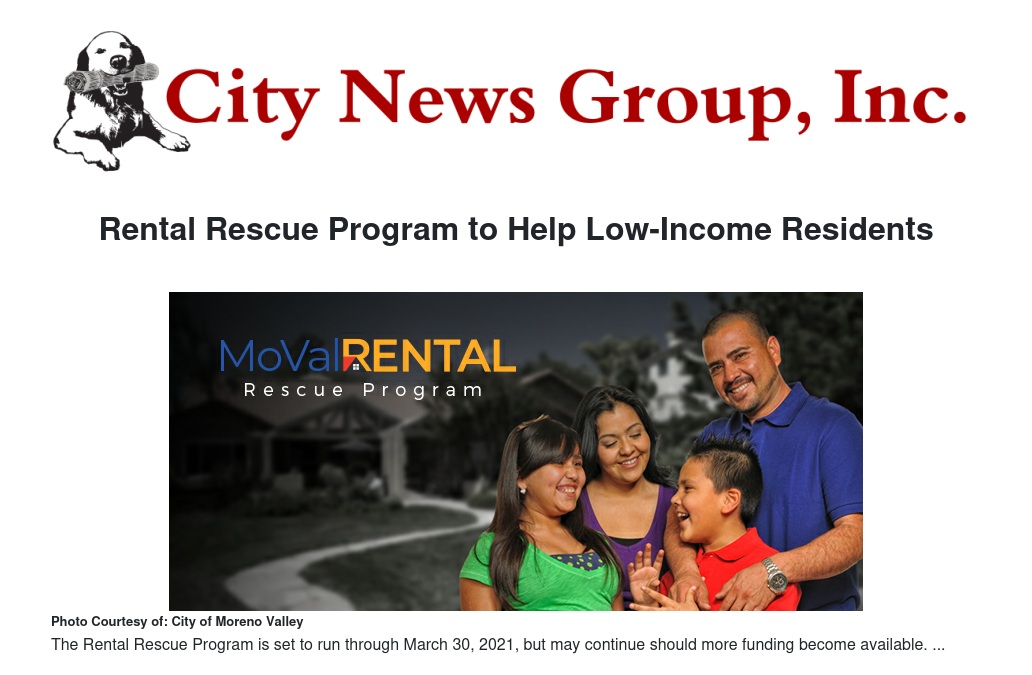 Moreno Valley Rental Rescue Program. Eligible households may have access to up to $5,000 to help with past-due rent or utilities, or costs of acquiring permanent housing, such as application fees, security or utility deposits, moving costs, etc.