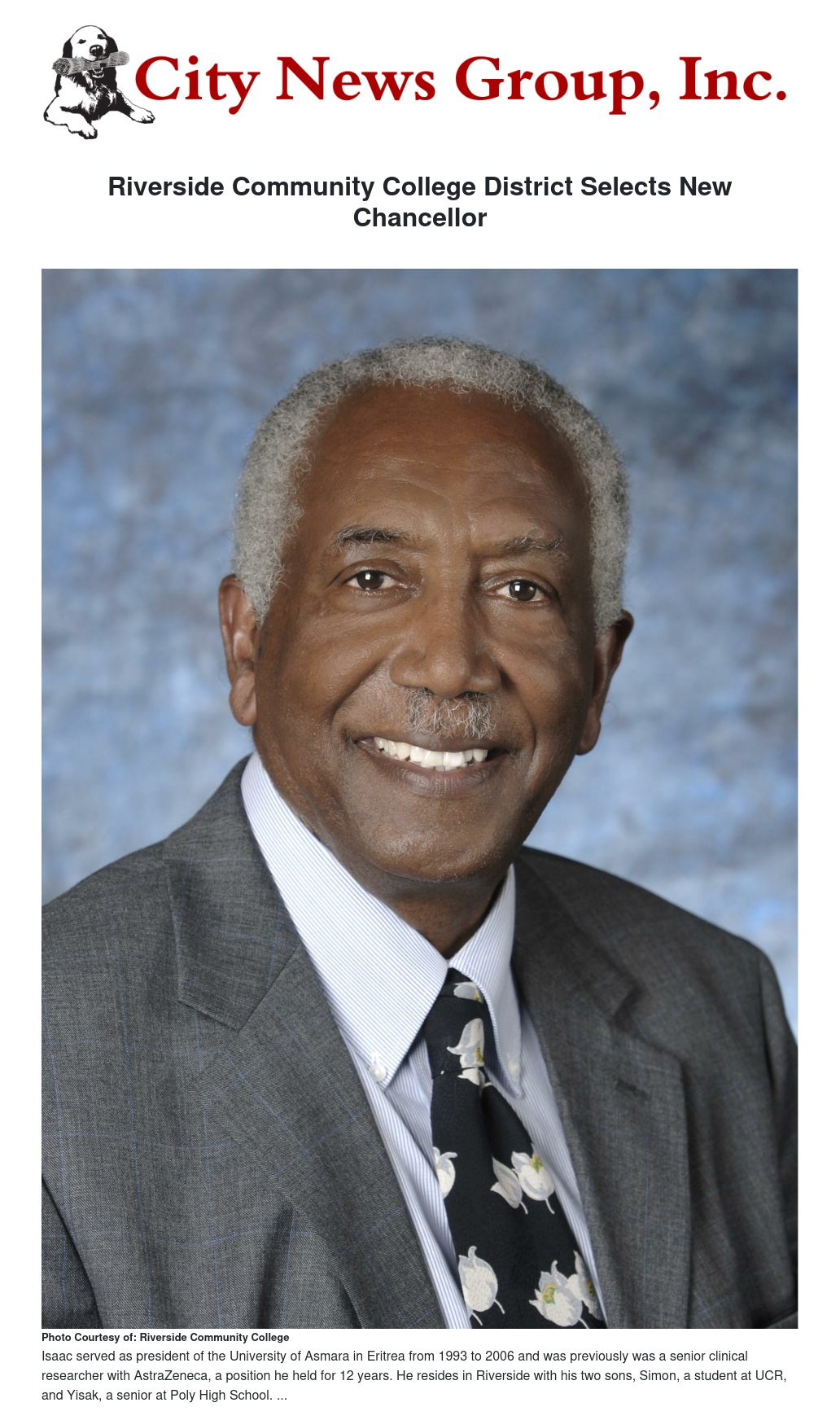 Isaac served as president of the University of Asmara in Eritrea from 1993 to 2006 and was previously was a senior clinical researcher with AstraZeneca, a position he held for 12 years. He resides in Riverside with his two sons, Simon, a student at UCR, and Yisak, a senior at Poly High School.