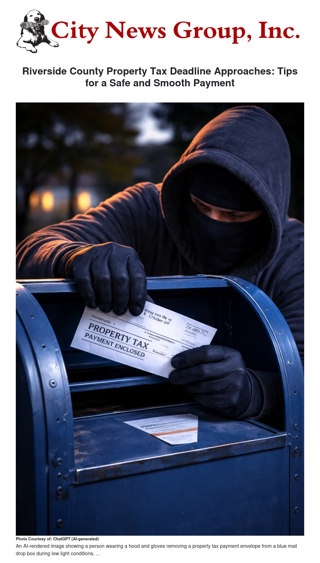 While no local incidents have been publicly confirmed in Riverside County, recent California news coverage has highlighted cases in other counties, where mailed property tax checks were stolen, altered, and fraudulently cashed. In those situations, homeowners remained responsible for their tax bills because the original payments were never credited.