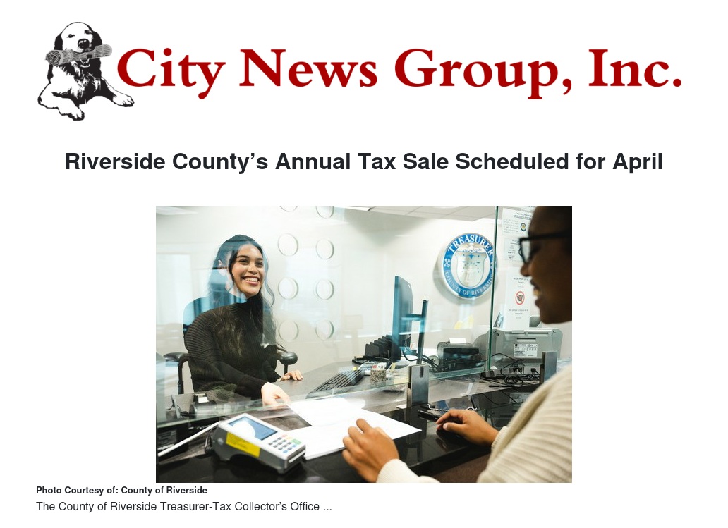 The County of Riverside Treasurer-Tax Collector’s Office is scheduled to host its annual tax sale on Thursday, April 25, 2024, and conclude on Tuesday, April 30, 2024, through an online auction platform, Bid4Assets.com.