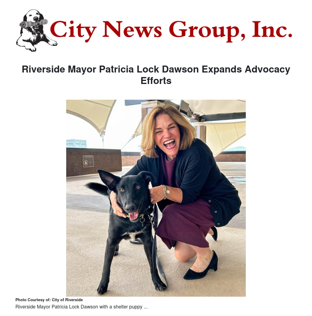 Mayor Patricia Lock Dawson is increasing her advocacy efforts on behalf of the City of Riverside by taking new and larger roles in the areas of public-private partnerships and climate. She also set aside some time to document how much Riversiders love their pets.