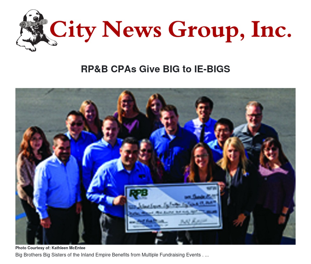 Roorda, Piquet & Bessee, Inc. (RP&B CPAs), a premier, full-service accounting firm located in the Inland Empire, presented a check for $13,368 to Big Brothers Big Sisters of the Inland Empire (IE-BIGS). The check represented the 2017 fundraising efforts of several events hosted by RP&B. The firm held a craft show, engaged in penny warfare, teamed up for a bowling event and hosted a poker tournament to encourage employees, clients and colleagues to donate to the firm’s 2017 charity of choice. All totaled the funds raised for IE BIGS, generated friendly competition and camaraderie and provided an element of downtime otherwise filled with busy business schedules.