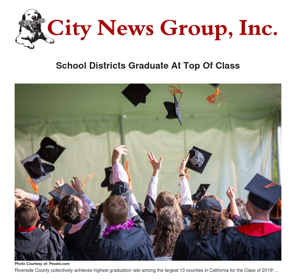 According to California Department of Education data released, the Riverside County graduation rate of 90.1 percent for the class of 2019 is #1 among the top 10 largest comparison counties in California for the first time in history.