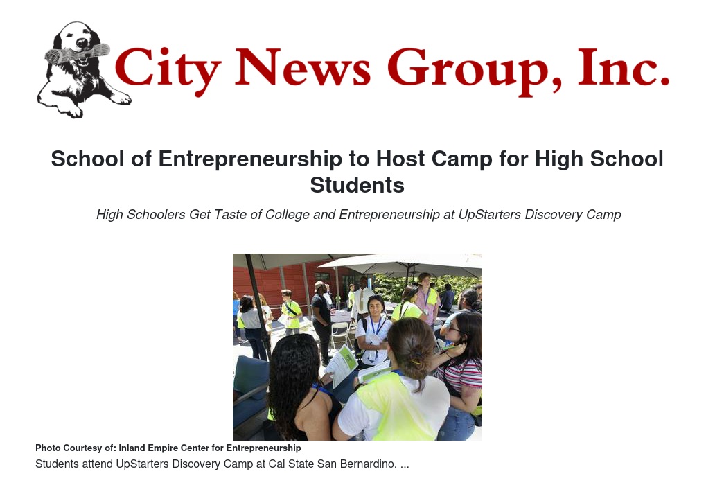 The School of Entrepreneurship from the Jack H. Brown College of Business and Public Administration at the California State University, San Bernardino (CSUSB) will be hosting the UpStarters Discovery Camp on campus so high school students can get a first-hand look at the college experience and get a taste of entrepreneurship this summer.