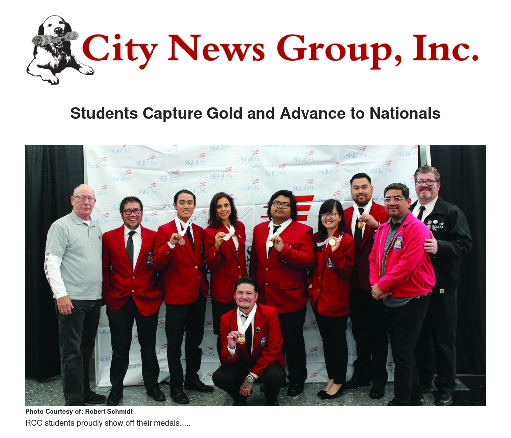 To reach the national finals, students had to capture gold in their respective state championship event. RCC captured gold medals in Graphics Imaging Sublimation -Phuong Vu; Advertising Design - Wade Abbas; Graphic Communications - Sotheara Ly; and Photography - Daniel Gamboa.