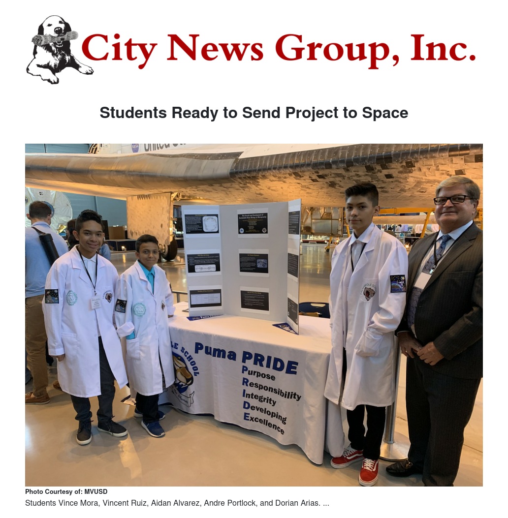The project, “The Grown and Development of Sustainable Brine Shrimp in Microgravity,” was developed by Palm Middle School Students Vince Mora, Vincent Ruiz, Aidan Alvarez, Andre Portlock, and Dorian Arias under the guidance of teacher Gayle DiCarlantonio. The project will examine how brine shrimp hatch and develop in microgravity, with a focus on how they adapt to a harsh environment. The team's ultimate goal would be to use their findings to contribute to the food chain in space or another planet.