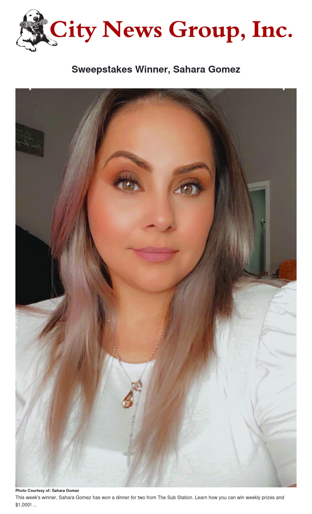 Although she didn't win the $1,000, he is still eligible! Sahara Gomez, resident of Moreno Valley is this week’s City News Group Inc. Sweepstakes weekly winner, earning herself three free subs and sodas from The Sub Station in Riverside.