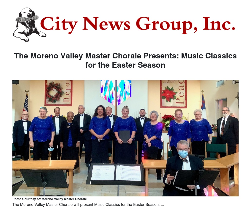 On Sunday, March 19, 2023, at 4:00 P.M., the Moreno Valley Master Chorale and Orchestra will present its spring concert: “Music Classics for the Easter Season.” The event will be held at the Shepherd of the Valley Lutheran Church, 11650 Perris Blvd., Moreno Valley, CA, 92557. This performance will include several works by Joseph Haydn, as well as his well-known “Missa Brevis St. Joannis de Deo.” Many beautiful songs from Felix Mendelssohn’s “Elijah” oratorio will also be sung, including “Lift Thine Eyes” with three-part women’s voices. To round out the program the Chorale will perform “Panis Angelicus,” “L’ Ange Gardien,” and “God is my Salvation” by César Franck.