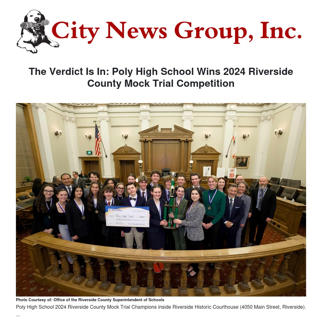 RIVERSIDE – After seven rounds of legal wrangling, the team of students from Poly High School in the Riverside Unified School District defeated Notre Dame High School in the finals of the 2024 Riverside County Mock Trial Competition at the Riverside Historic Courthouse (4050 Main Street, Riverside). For the finals, Poly represented the Prosecution, and Notre Dame argued for the Defense. Martin Luther King High School and Chaparral High School shared third place.