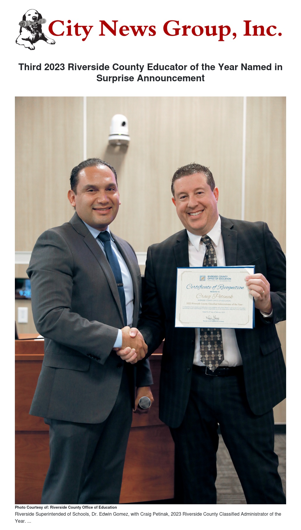 Third 2023 Riverside County Educator of the Year Named in Surprise Announcement by Jonathan Moreno - City News Group, Inc.
