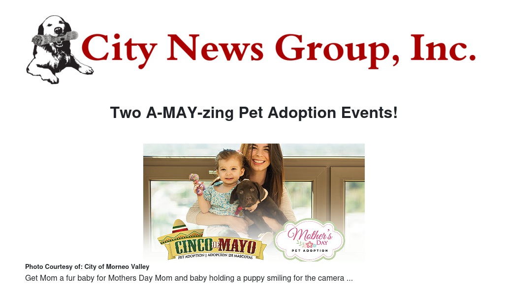 Both adoption events are being held at the Moreno Valley Animal Shelter, 14041 Elsworth Street. Pets adopted that have not been altered will stay for surgery and will be available to go home on the afternoon of the day surgery is scheduled.