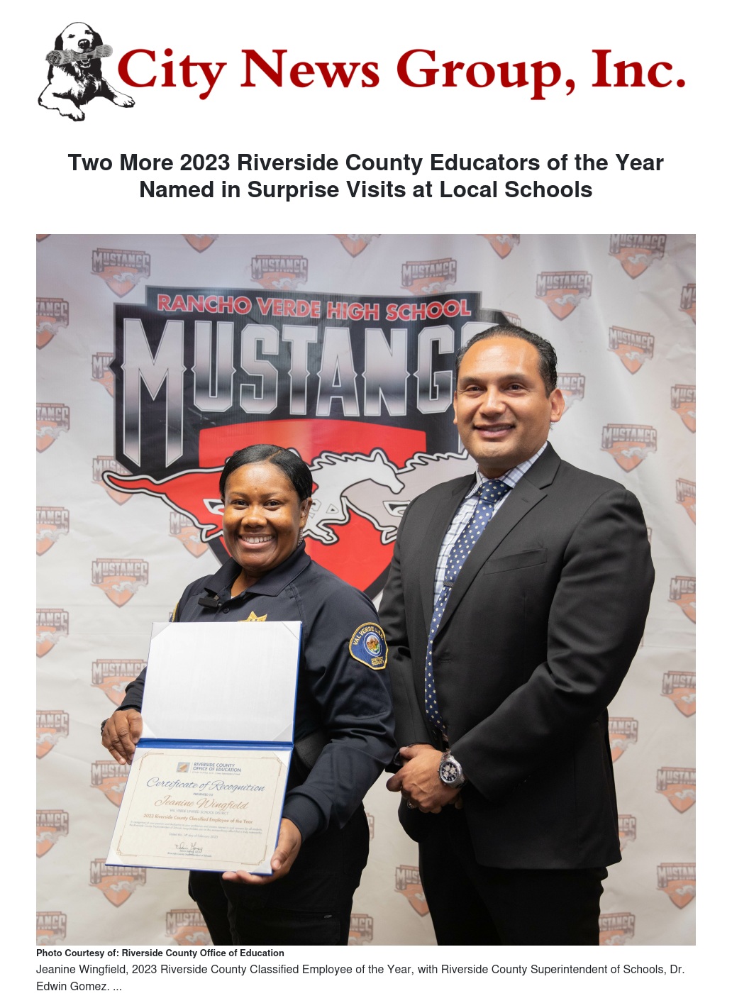 - Riverside County Classified Employee of the Year: Jeanine Wingfield, District Security Officer II, Moreno Valley Unified School District