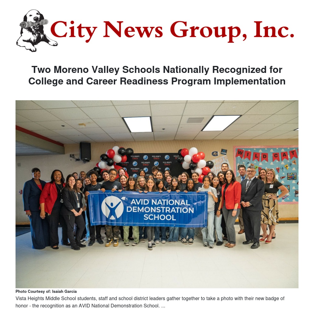 The Moreno Valley Unified School District is proud to offer AVID strategies and programs across the entire district, now with a special badge of honor for students attending Vista Heights Middle School and Cloverdale Elementary School.