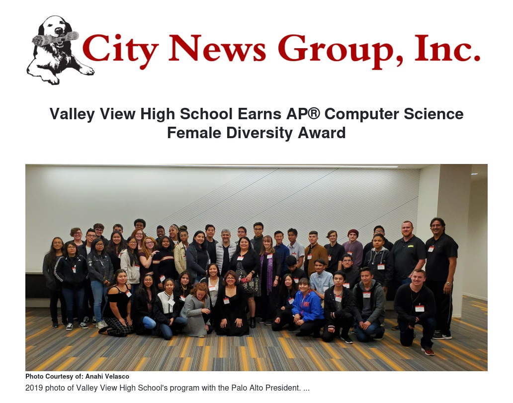 The College Board has recognized Valley View High School with the AP® Computer Science Female Diversity Award for expanding young women’s access to AP Computer Science A (CSA). This award acknowledges 1,119 schools for their work toward equal gender representation during the 2019-20 school year—nearly 37 percent more than the 818 schools recognized last year.