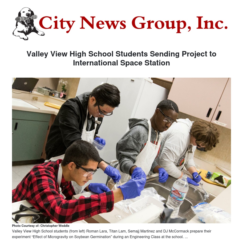 A group of four students at Valley View High School will see their science project launch into space later this year after being selected for the Student Spaceflight Experiments Program (SSEP). The National Center for Earth and Space Science Education (NCESSE), in partnership with DreamUp PBC and NanoRacks LLC, recently announced the selection of Valley View High School’s microgravity experiment to fly aboard the International Space Station (ISS) aboard SSEP Mission 12, scheduled for launch in the Spring or Summer of 2018.
