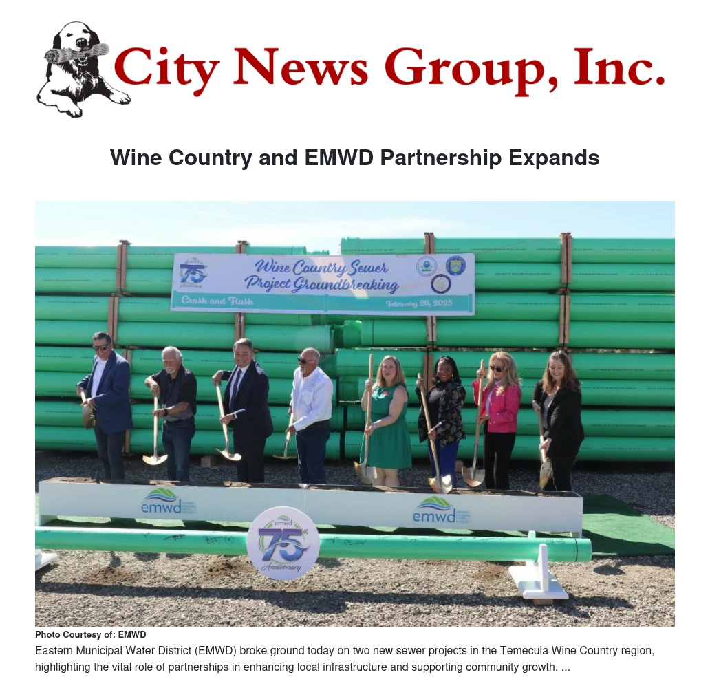 Eastern Municipal Water District (EMWD) broke ground today on two new sewer projects in the Temecula Wine Country region, highlighting the vital role of partnerships in enhancing local infrastructure and supporting community growth.
