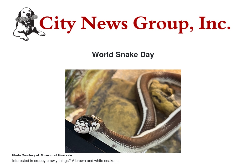 Celebrate World Snake Day with the Museum of Riverside! Meet some of our live snakes and learn about their fascinating biology, dispel the myths surrounding them, and hear what you can do to help conserve these important players in our local ecosystems.