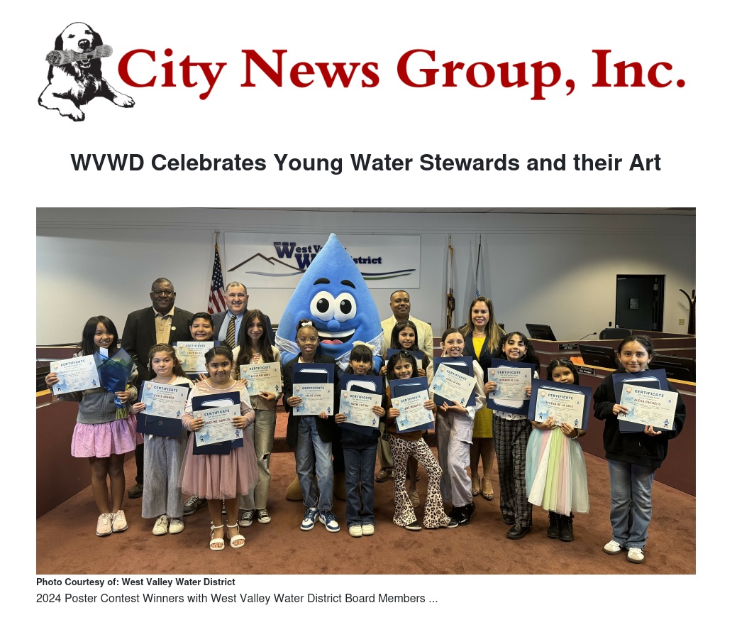 “The annual poster contest is an exciting opportunity to educate the community about conserving our most crucial resource: water,” said WVWD Board Director Angela Garcia. “Congratulations to all our 2024 student winners and thank you to the parents, teachers and school officials who supported these students throughout the process. The success of programs like these to engage and educate our local students starts with you.”